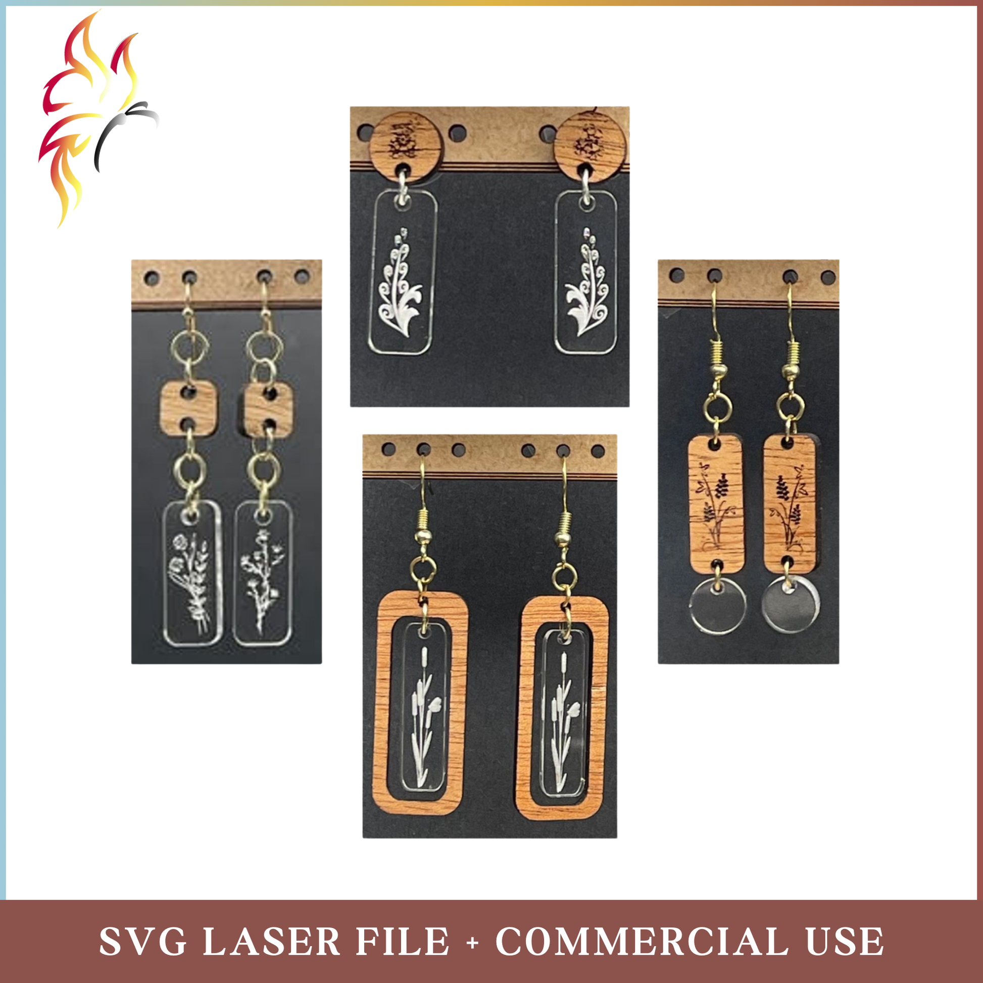 Pictured is 1/8" sapele and ⅛” clear acrylic, but any laser-safe material should work. Hypoallergenic yellow gold jump rings, 3 sets of earring hooks, and 1 set of earring posts and backers were used to assemble the earrings in the photo.